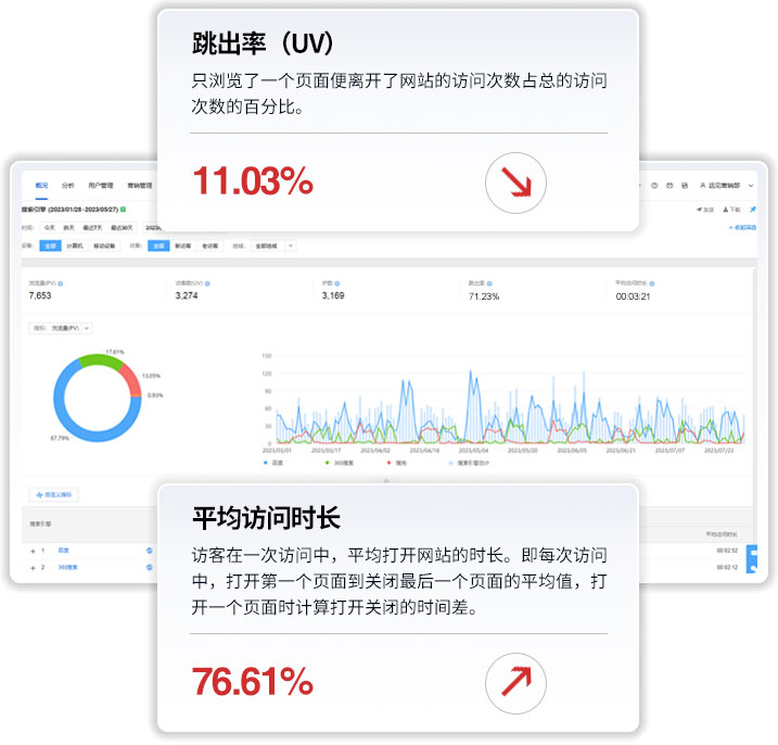 網站跳出率和平均訪問時長可以反映出網站推廣關鍵詞的選擇是否精準,文案的撰寫是否優秀,著陸頁的設計是否符合用戶體驗